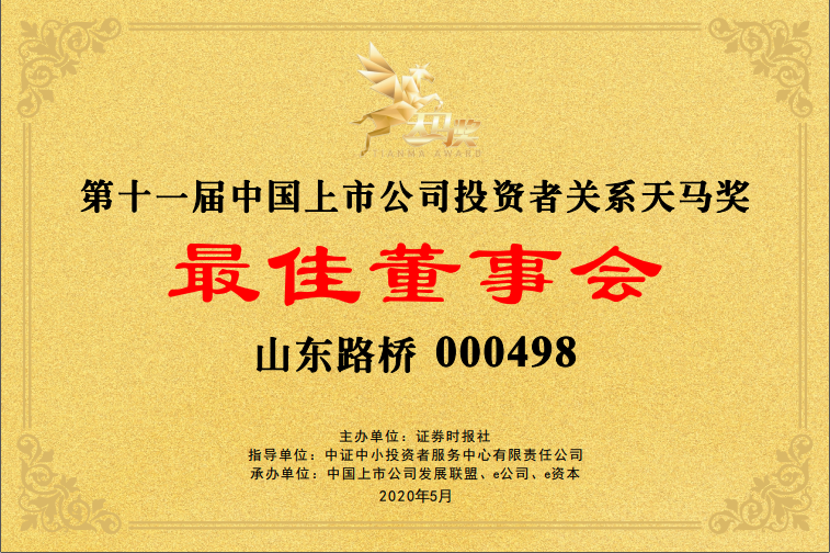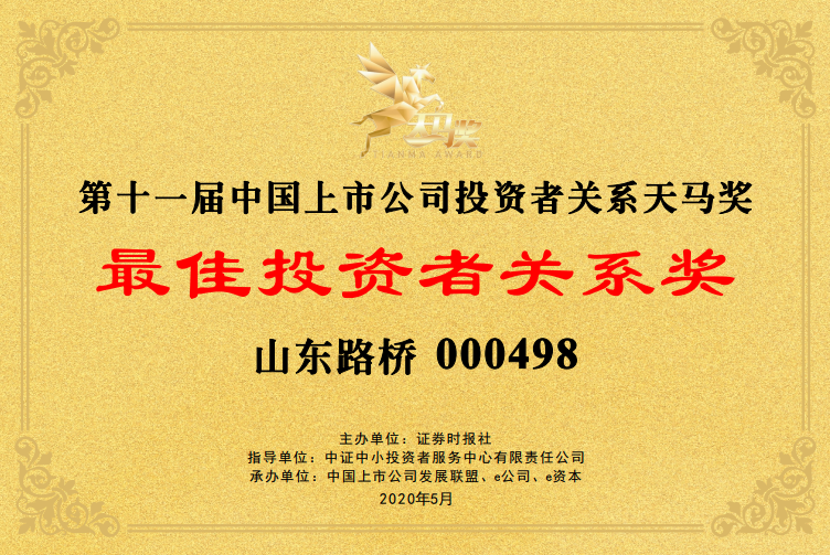 山東路橋第11屆中國上市公司投資者關(guān)系天馬獎寄語,黨委書記、董事長王振江: 山東路橋堅(jiān)持生產(chǎn)經(jīng)營和資本運(yùn)作“雙輪驅(qū)動”,發(fā)展質(zhì)量和效益增長“兩翼齊飛”。公司作為全國首批公路工程施工總承包特級資質(zhì)企業(yè),擁有施工“雙特級”和設(shè)計(jì)“雙甲級”等69項(xiàng)資質(zhì),先后參與全國三十幾個省市的路橋施工建設(shè),用一流的質(zhì)量樹立了信得過的“山東路橋”品牌形象。同時,公司堅(jiān)持規(guī)范與發(fā)展并重,信披與治理并行,以“富員強(qiáng)企、通達(dá)天下”為使命,做讓投資者看得見、看得清的上市公司,打造基業(yè)長青的百年老店。未來,公司將充分把握高質(zhì)量發(fā)展契機(jī),不斷挖掘新的收入、利潤增長點(diǎn),走穩(wěn)健合規(guī)發(fā)展之路。扎根實(shí)體,練好內(nèi)功,突出主業(yè),弘揚(yáng)企業(yè)家精神和工匠精神,與投資者共享發(fā)展紅利。