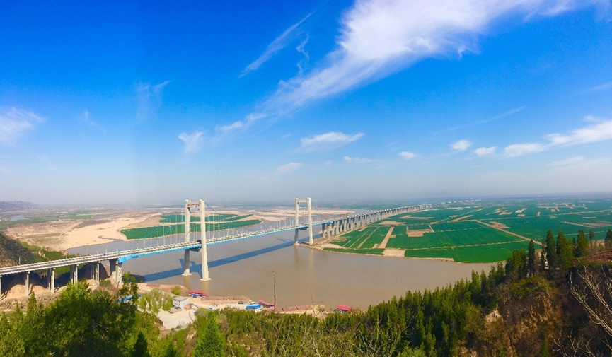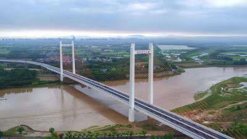 濟(jì)齊黃河公路大橋位于濟(jì)南市槐蔭區(qū)與德州市齊河縣交界處,是山東省委省政府“一圈一帶”發(fā)展戰(zhàn)略的重要基礎(chǔ)設(shè)施工程。大橋全長3767.9米,主橋采用塔墩固結(jié)、塔梁分離半漂浮體系,全長840米,主跨為單跨跨徑410米雙塔雙索面鋼-混組合梁斜拉橋,是黃河流域單跨最大的斜拉橋。該橋進(jìn)一步拉近濟(jì)南與齊河之間的距離,大大加快德州融入省會經(jīng)濟(jì)圈的腳步。